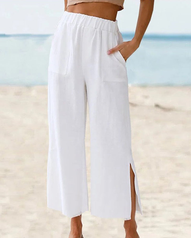Avslappnad enfärgad slitsbyxor med ficka