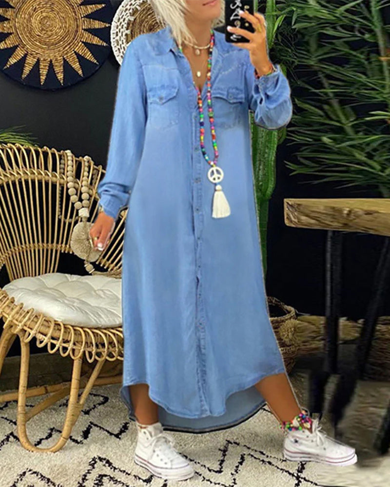 Enfärgad Denimklänning för kvinnor med lång ärm