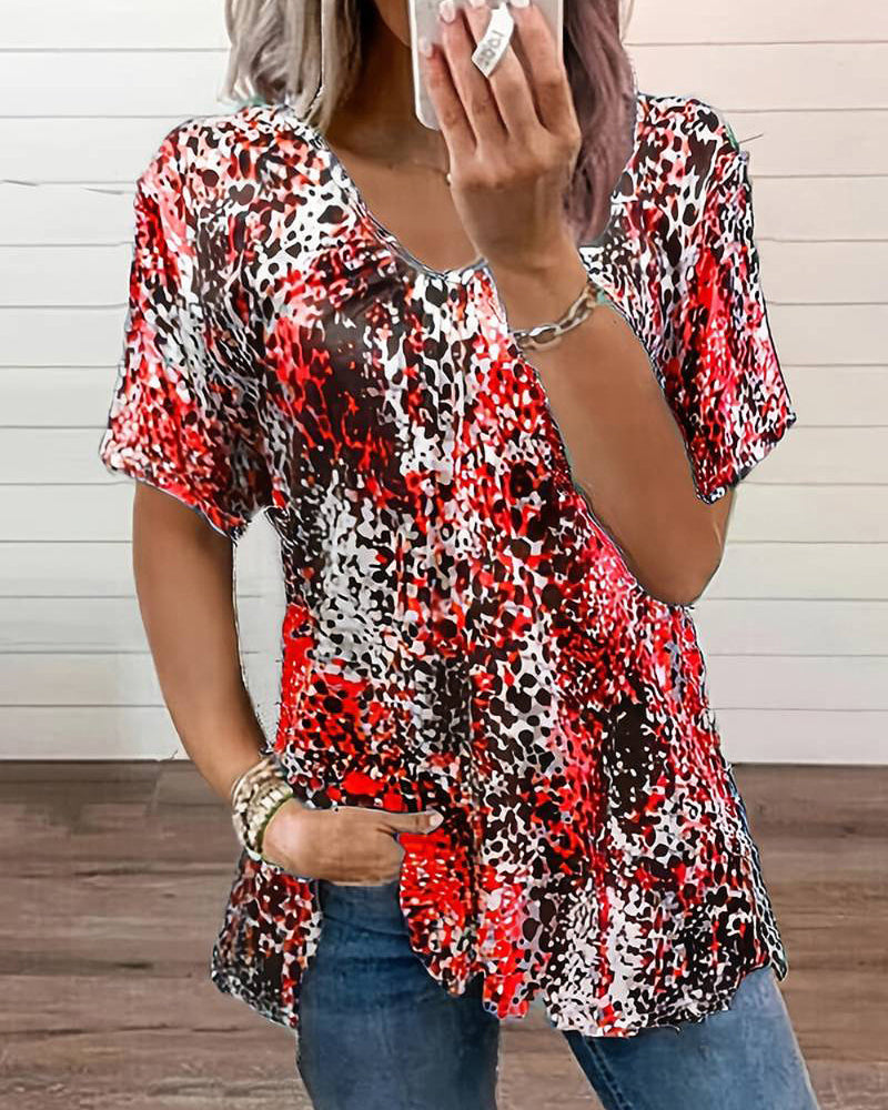 Rynkad v-ringad topp i leopardmönster och korta armar