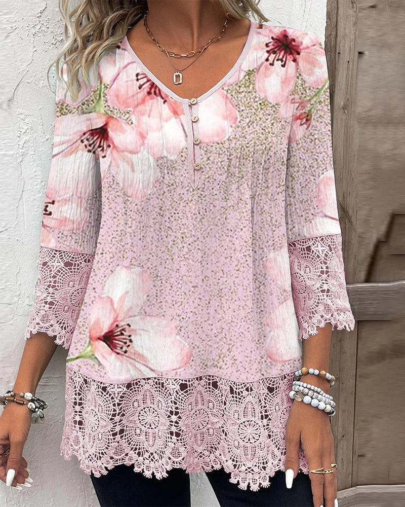 Topp med blommönster med spetssömmar