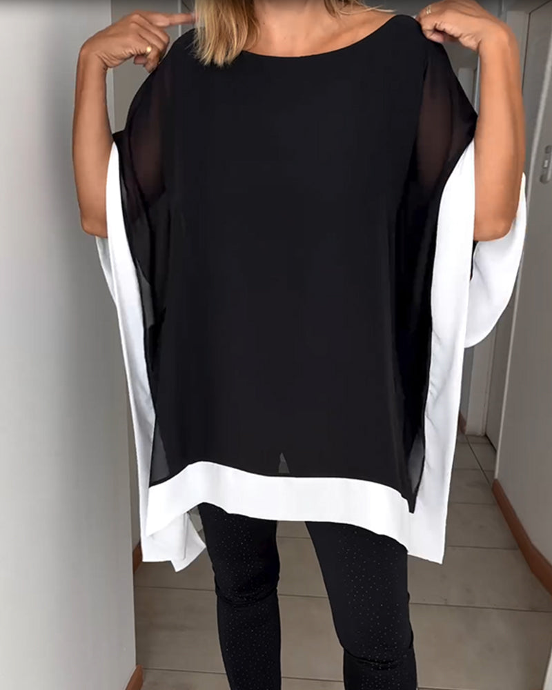 Topp med fladdermuspatchwork och rund hals