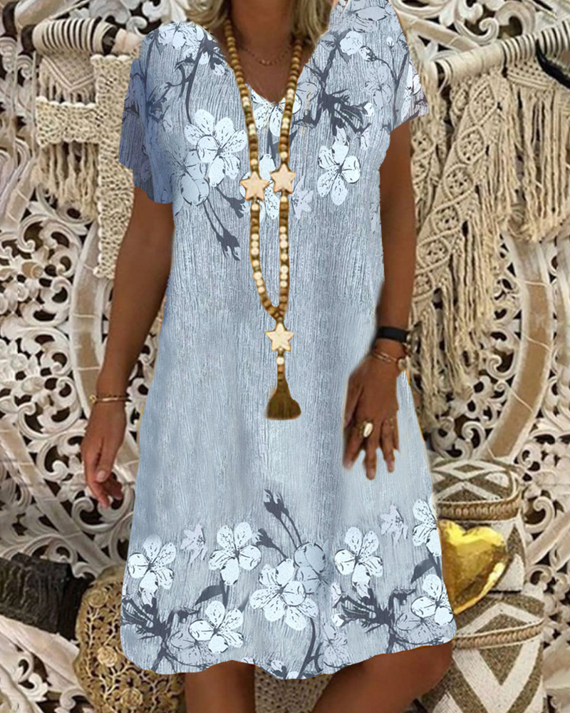 V-ringad avslappnad klänning i blommönster med kort ärm
